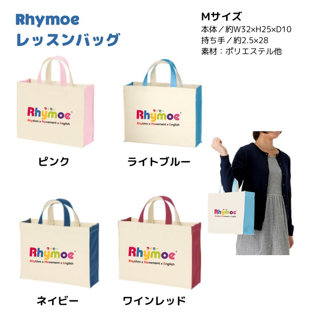 【ご確認ください】 Rhymoeロゴバッグは認定インストラクターのみ購入可です。 (インストラクター割引適用はありません) カラフルなRhymoeとRhymoe Phonicsのロゴを中央に大きく配置した、使いやすいレッスンバッグです。 Mサイズは園児に最適な大きさで、A4のRhymoe Phonicsワークブックがすっぽり入ります。マチも10センチあるので、ライフォカードも一緒に入れることができます。 ご注意:こちらのバッグは洗濯不可です。使用前に防水スプレーの使用をお勧めします。 Mサイズ 本体/約W32×H25×D10 持ち手/約2.5×28 素材:ポリエステル他 カラー:ライトブルー、ピンク、ワインレッド、ネイビー ================ 送料について 1-3個の場合ーバッグ送料(S) 地域別送料 4個以上ーバッグ送料(M) 地域別送料 総額3万円以上のお買い上げで送料無料となります。