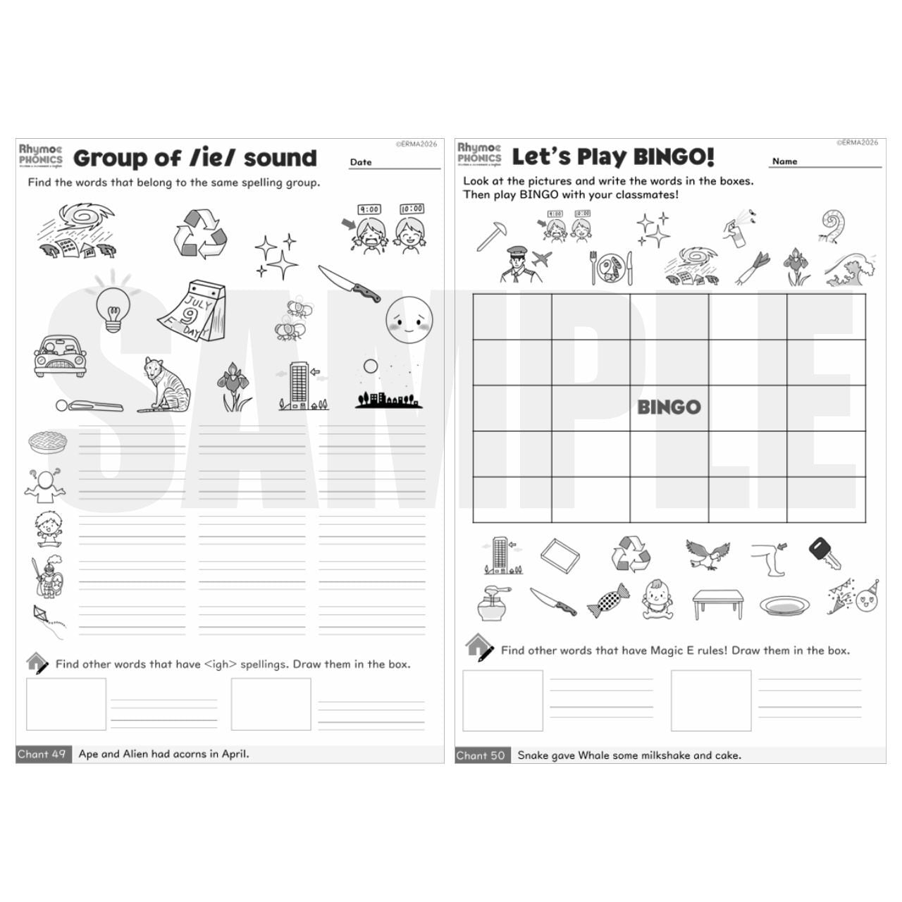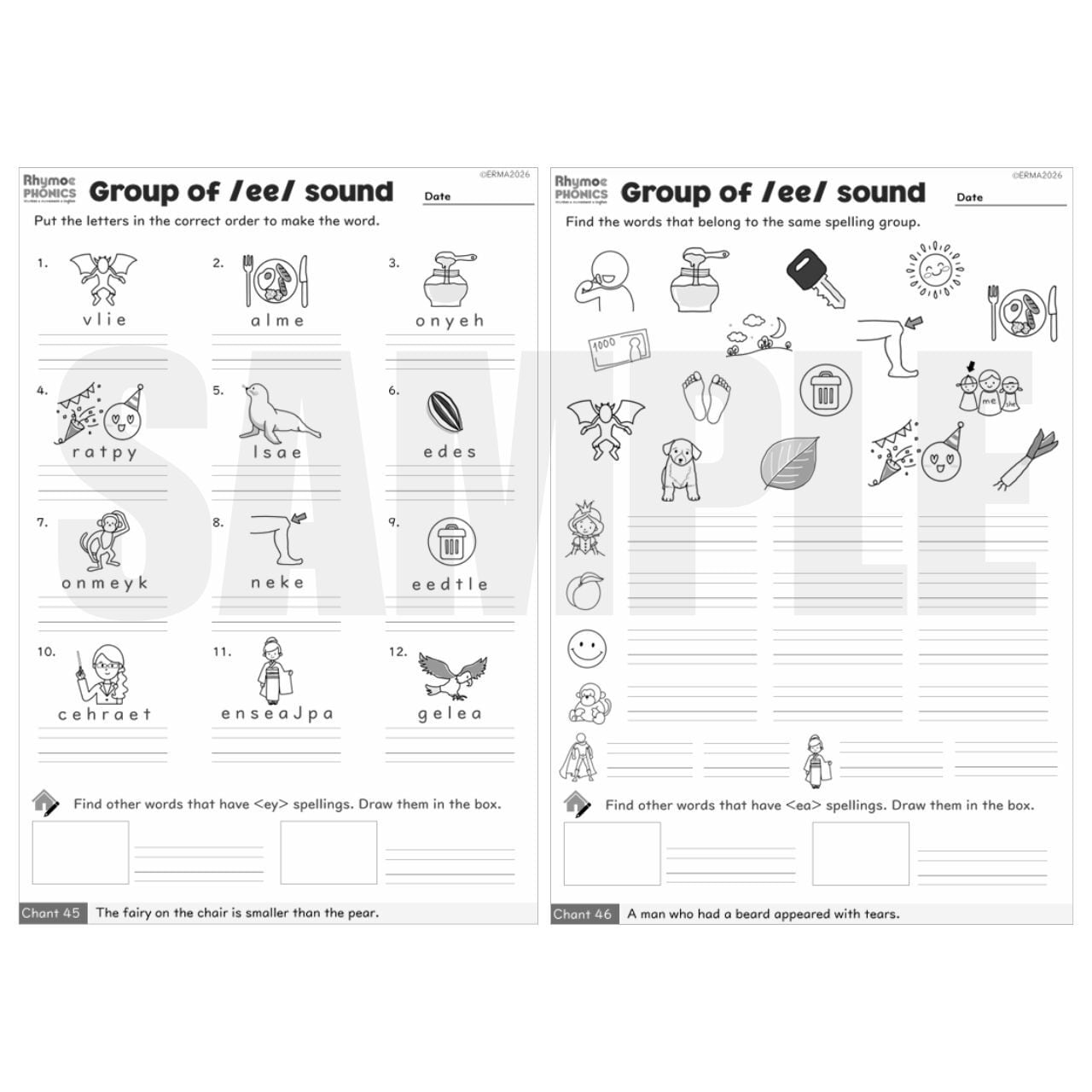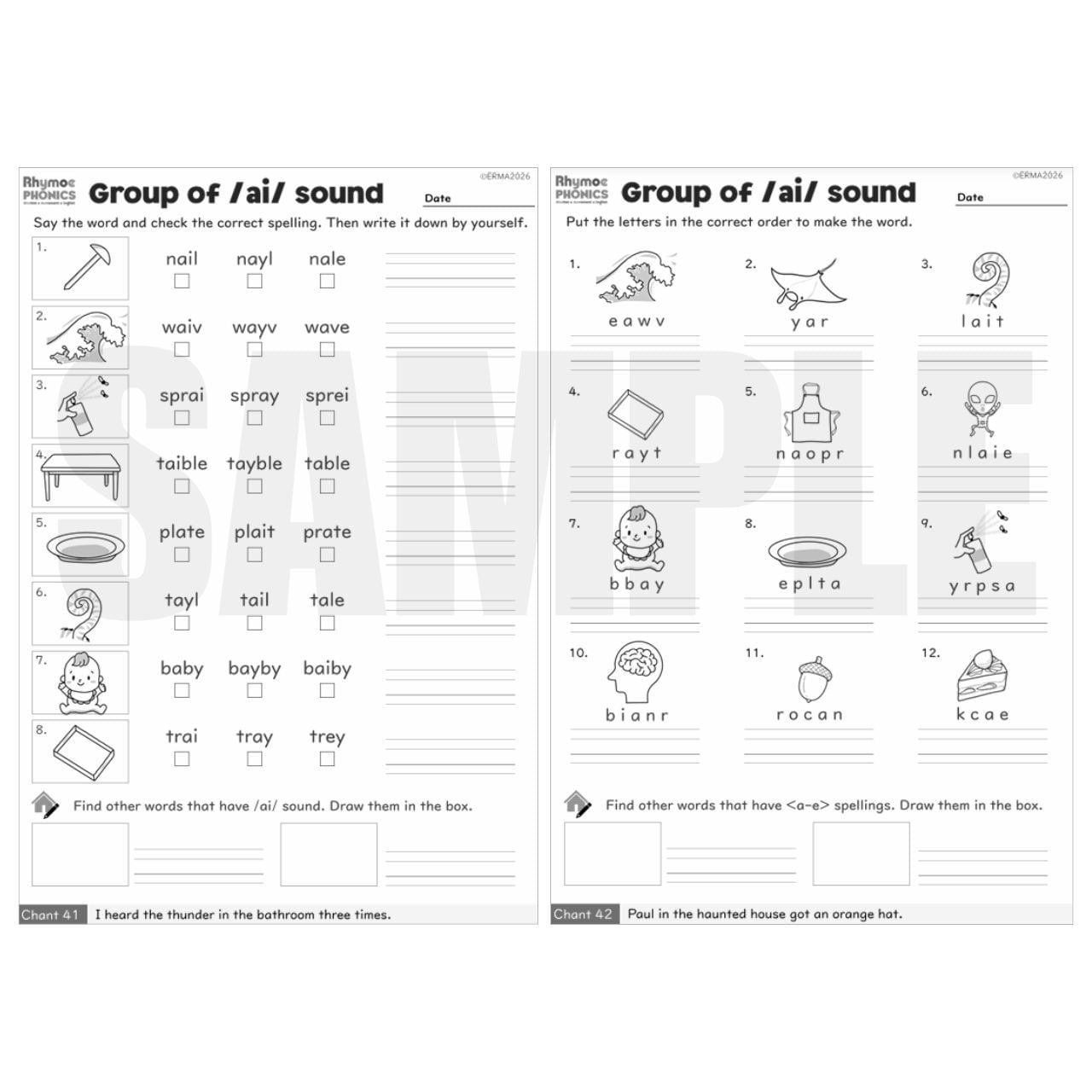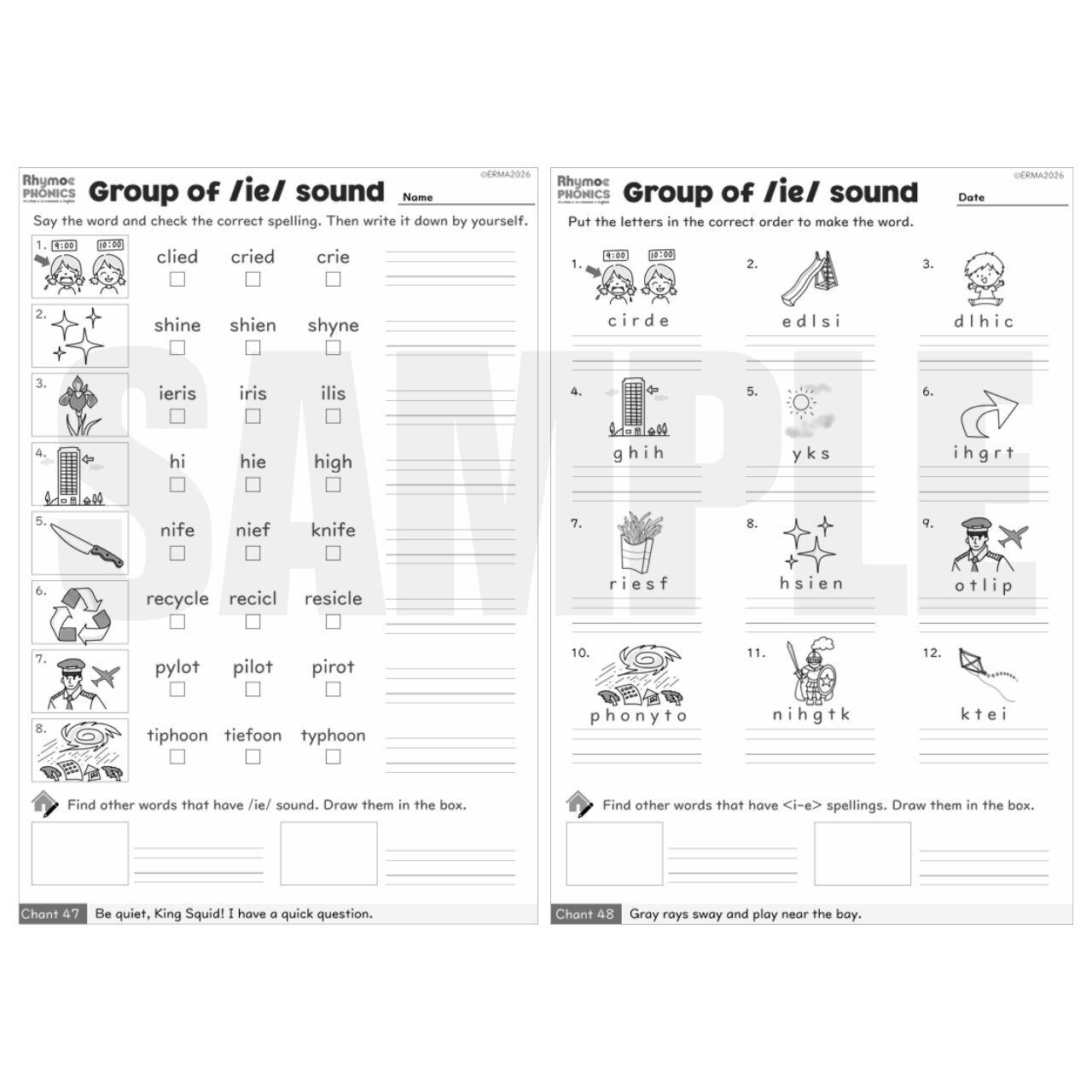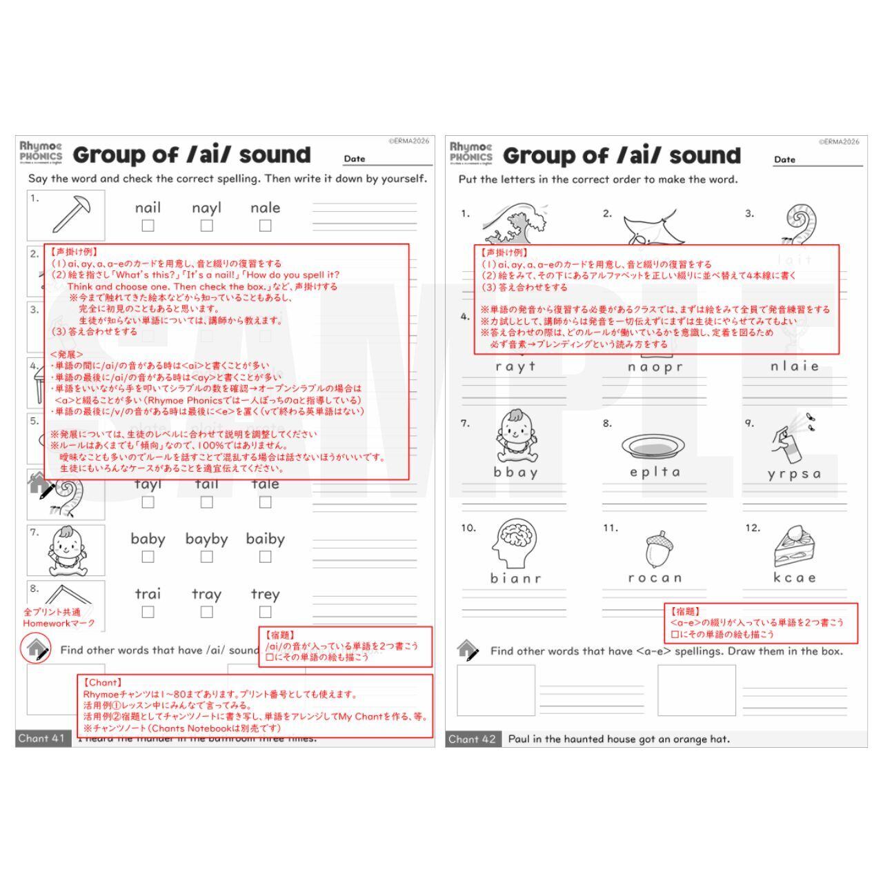 • アクティビティシート(10枚):/ai/, /ee/, /ie/ の音を持つ単語の綴りを選んで書く練習、バラバラの文字を並べ替える
